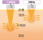 1つのプローブで1MHz・3MHzに対応。プローブの中の結晶体を伸縮させることで「圧電効果」による音波を発生。1秒間に100万回(1MHz)/300万回(3MHz)の高速度ミクロマッサージにより、深部に直接刺激を与えることができます。